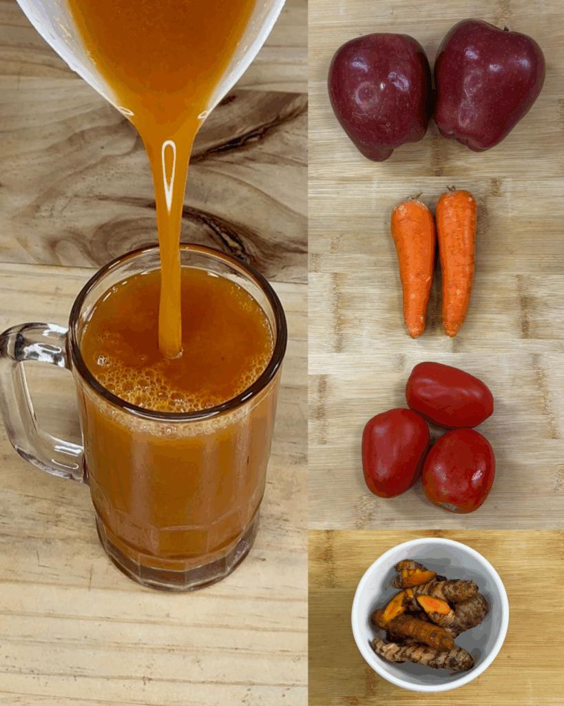 - Coloca la manzana, el tomate, la cúrcuma y la zanahoria en la licuadora.
