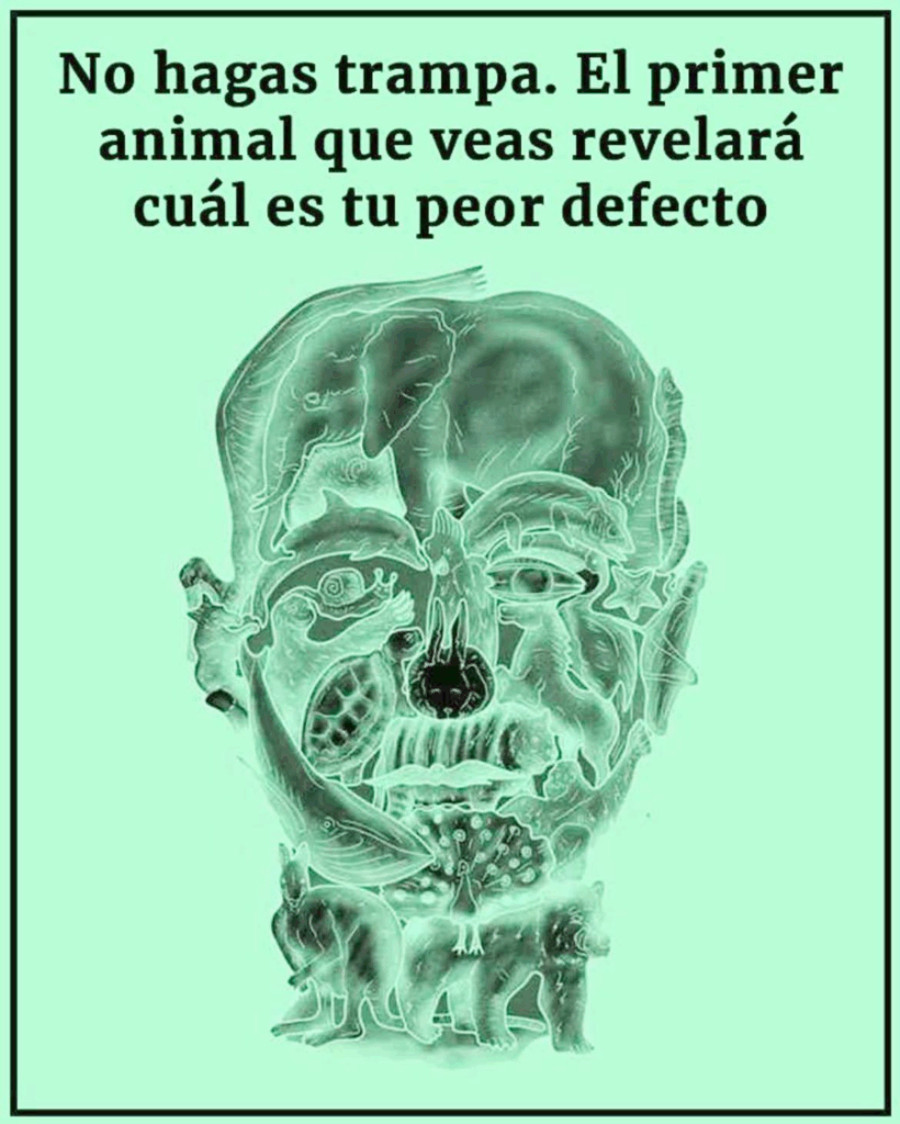 En redes sociales circula constantemente una imagen con múltiples animales ocultos, acompañada de la frase: “No hagas trampa. El primer animal que veas revelará cuál es tu peor defecto”. Se trata de una ilustración que, a simple vista, parece el contorno de un rostro humano, pero que esconde diversas figuras de animales superpuestas. Este tipo de pruebas visuales o “tests” se ha vuelto muy popular, pues despierta la curiosidad y el debate sobre si realmente pueden reflejar rasgos de la personalidad de quien las observa.