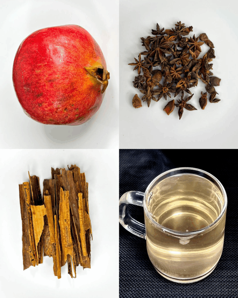 2️⃣ Coloca en una cacerola las cáscaras de granada, el anís estrellado y los tallos de canela.