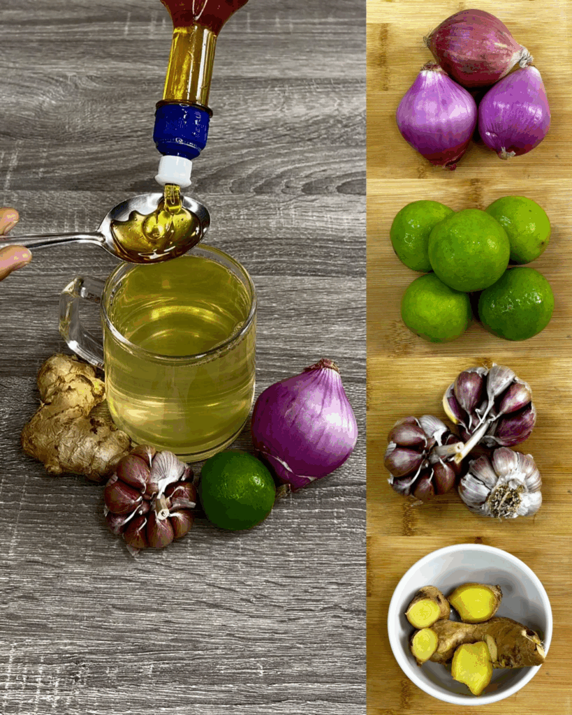 1️⃣ Corta la cebolla, el limón (con cáscara), los ajos (con cáscara) y el jengibre en trozos pequeños