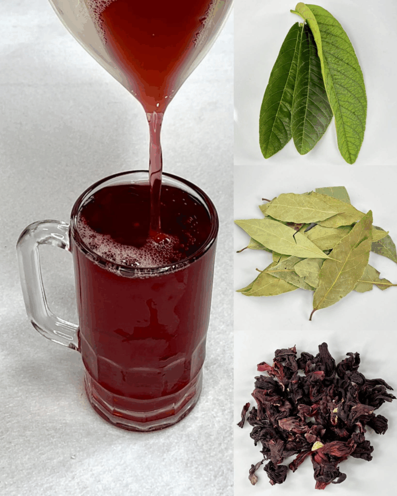 2️⃣ Agrega las hojas de laurel, la flor de Jamaica y las hojas de guayaba.