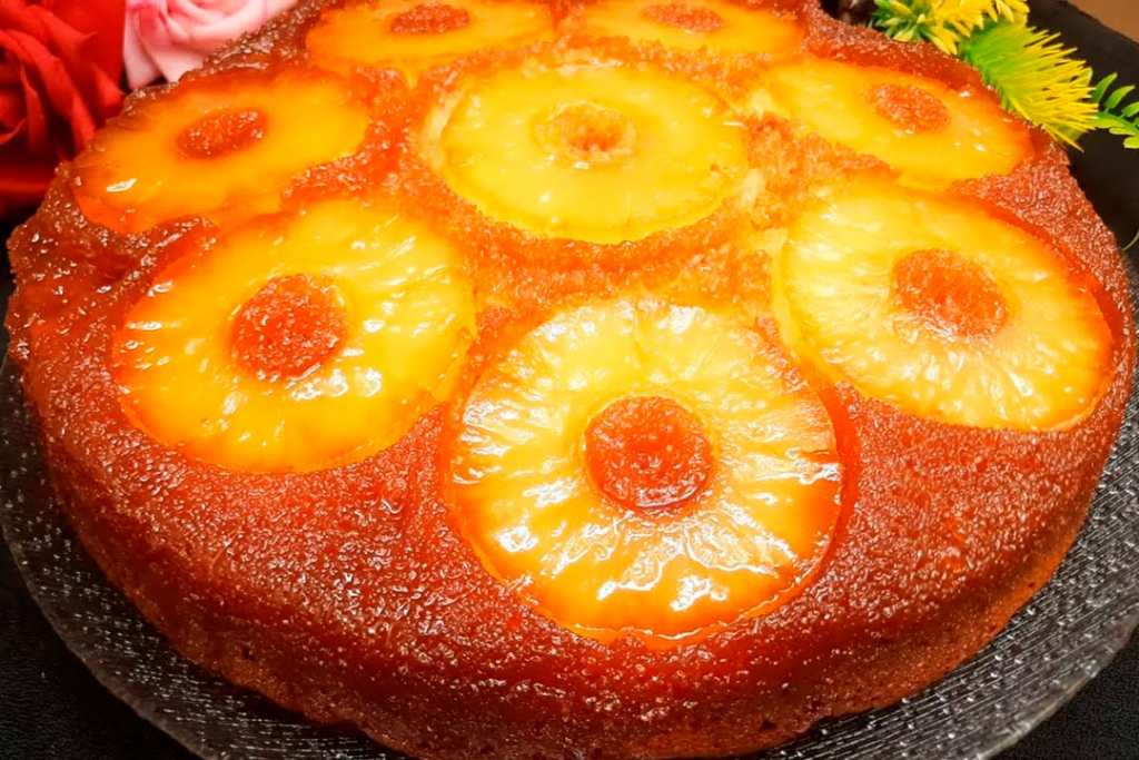 14. Coloca un plato grande sobre el molde y, con cuidado, invierte el pastel para que la cobertura de piña quede en la parte superior.